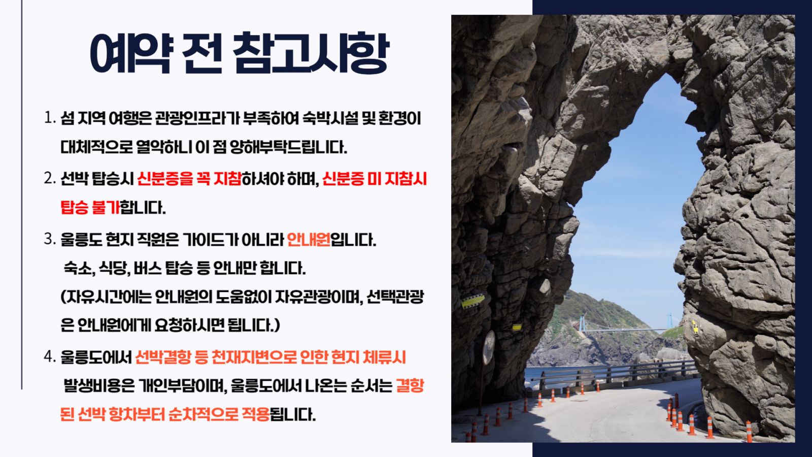 - 울릉도에 체류된 채로 결항 될 경우 선박 출항 순서는 입도 순서에 따르며, 연장되는 모든 숙박비용 및 개인비용은 고객 부담입니다.