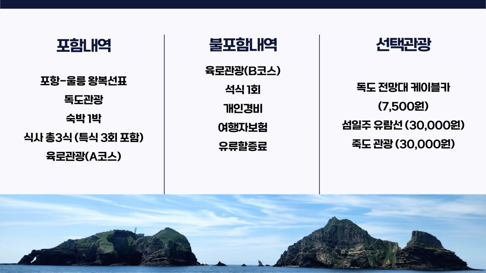 - 독도는 기상이 좋을 경우 배가 선착장에 정박할 수 있으며, 기상에 의하여 독도 선회 관광이 진행될 시 별도의 환불금이 없습니다.