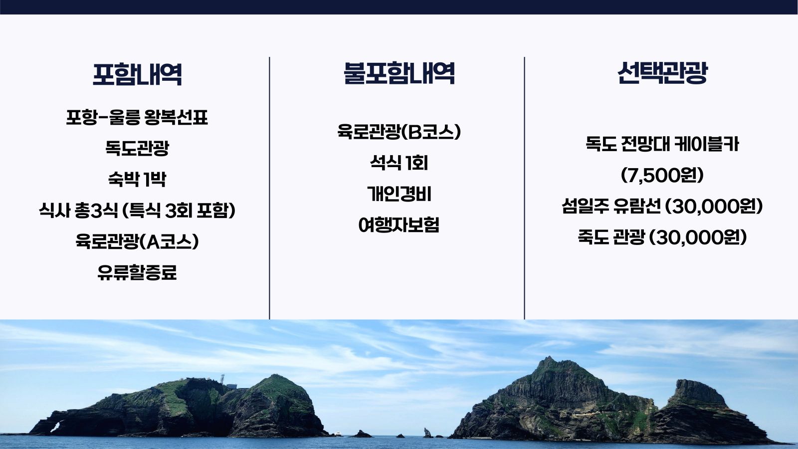 - 독도는 기상이 좋을 경우 배가 선착장에 정박할 수 있으며, 기상에 의하여 독도 선회 관광이 진행될 시 별도의 환불금이 없습니다.