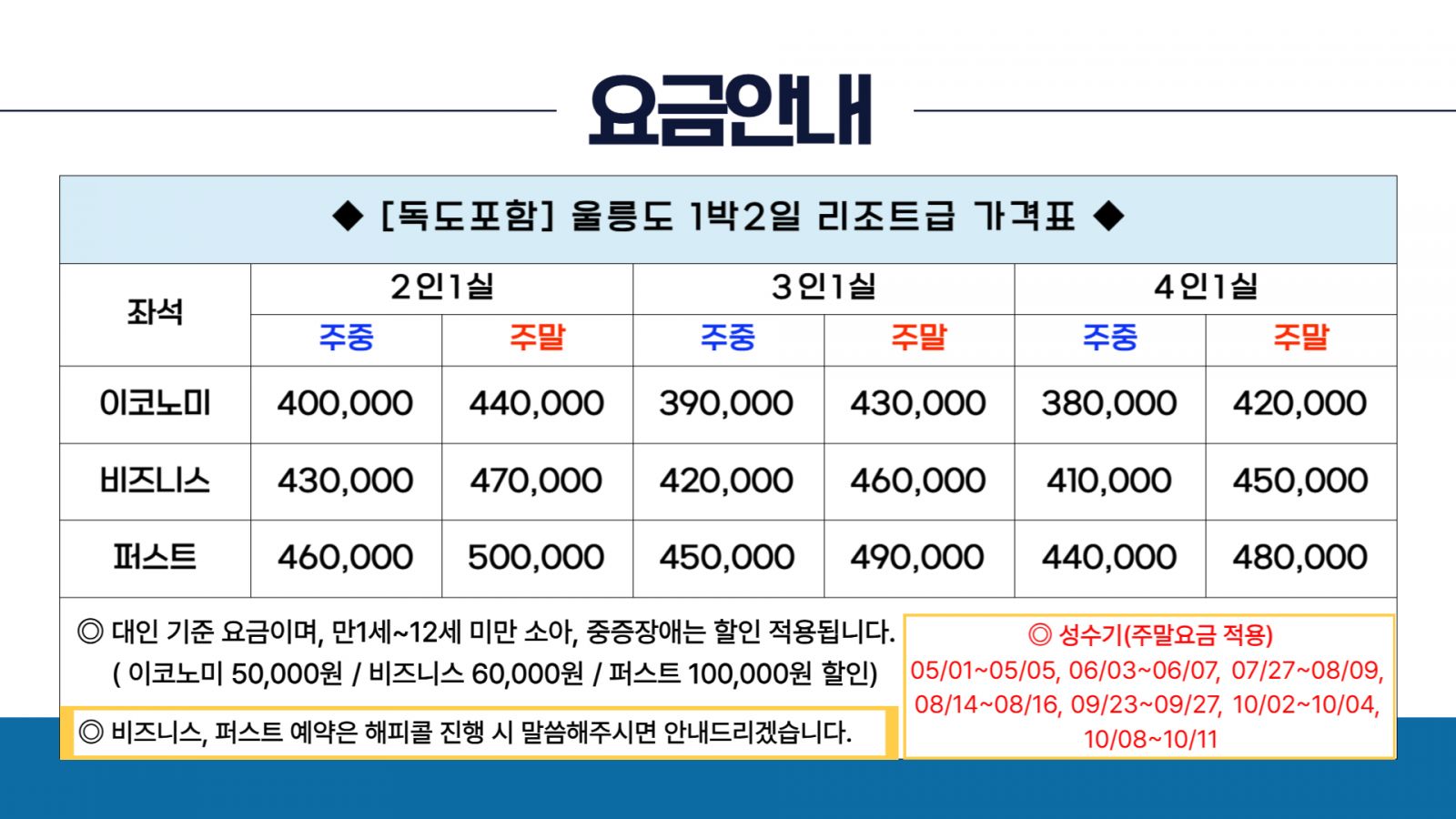 - 울릉도에 체류된 채로 결항 될 경우 선박 출항 순서는 입도 순서에 따르며, 연장되는 모든 숙박비용 및 개인비용은 고객 부담입니다.