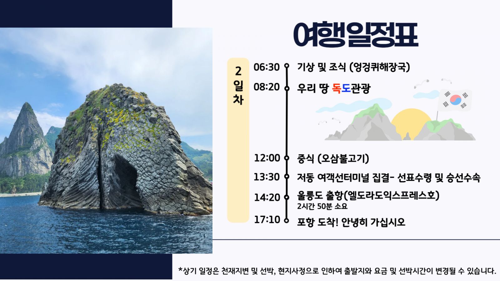 - 독도관광은 이용객의 인원에 따라 운항이 취소 될 수 있습니다.
