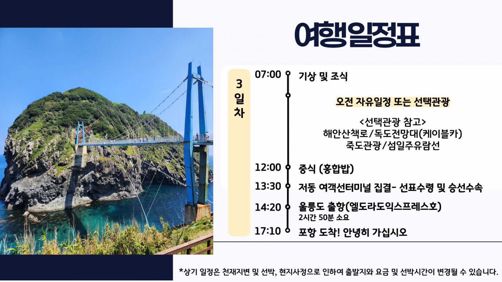 - 울릉도에 체류된 채로 결항 될 경우 선박 출항 순서는 입도 순서에 따르며, 연장되는 모든 숙박비용 및 개인비용은 고객 부담입니다.