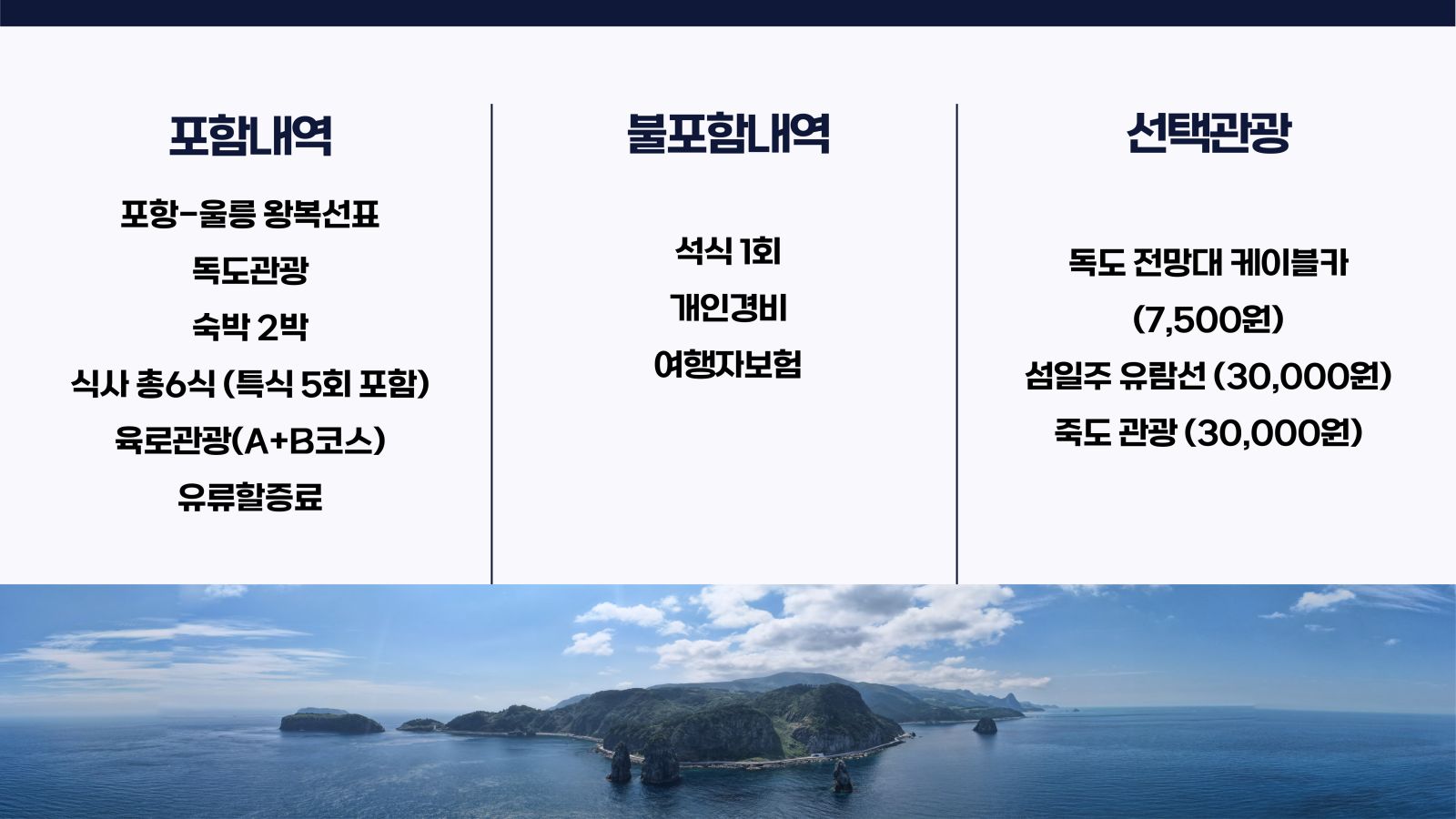 - 독도는 기상이 좋을 경우 배가 선착장에 정박할 수 있으며, 기상에 의하여 독도 선회 관광이 진행될 시 별도의 환불금이 없습니다.