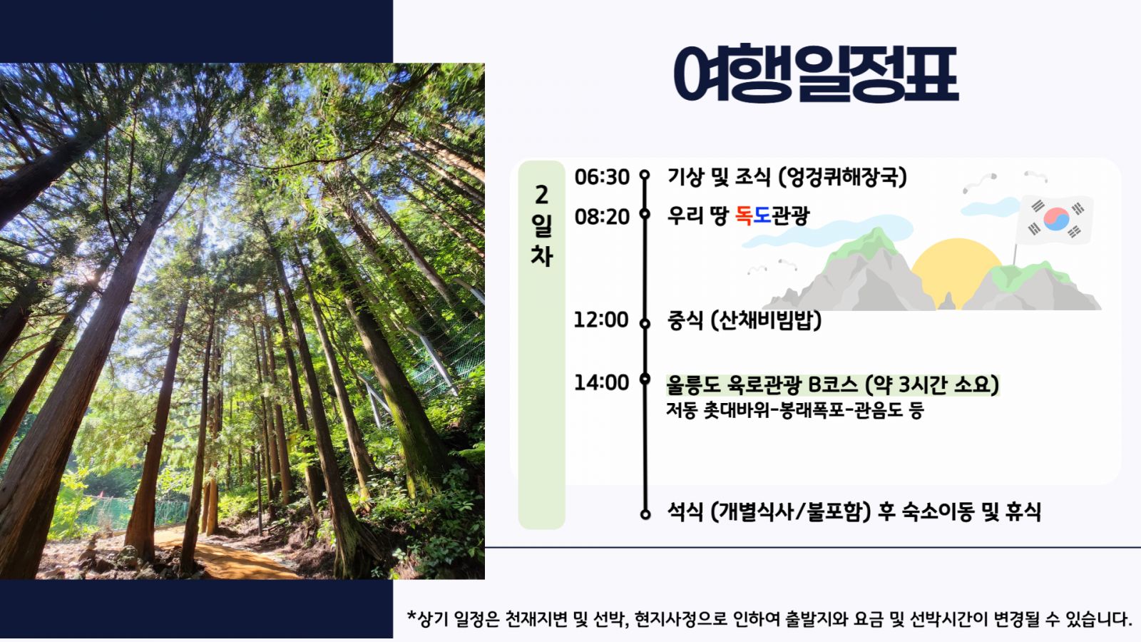 - 울릉도에 체류된 채로 결항 될 경우 선박 출항 순서는 입도 순서에 따르며, 연장되는 모든 숙박비용 및 개인비용은 고객 부담입니다.