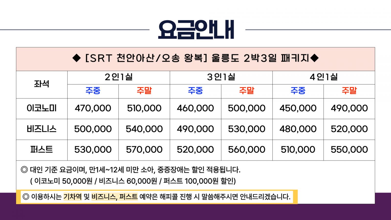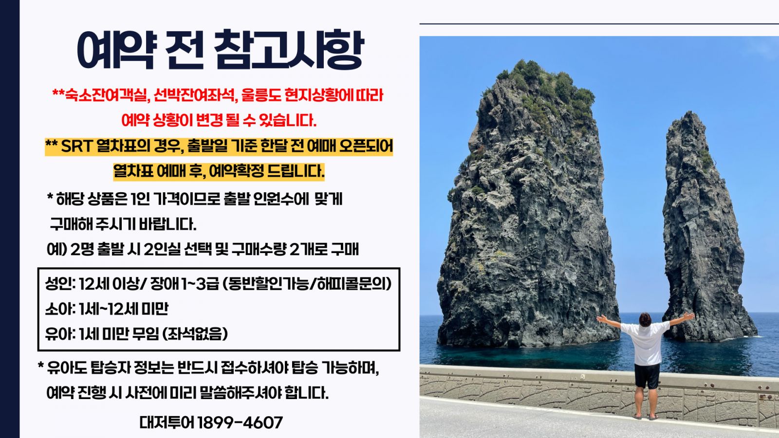- 섬 지역 특성상 울릉도 숙소는 열악하므로 고객님의 협조와 양해 부탁드립니다.(개인 세면도구 필 참)