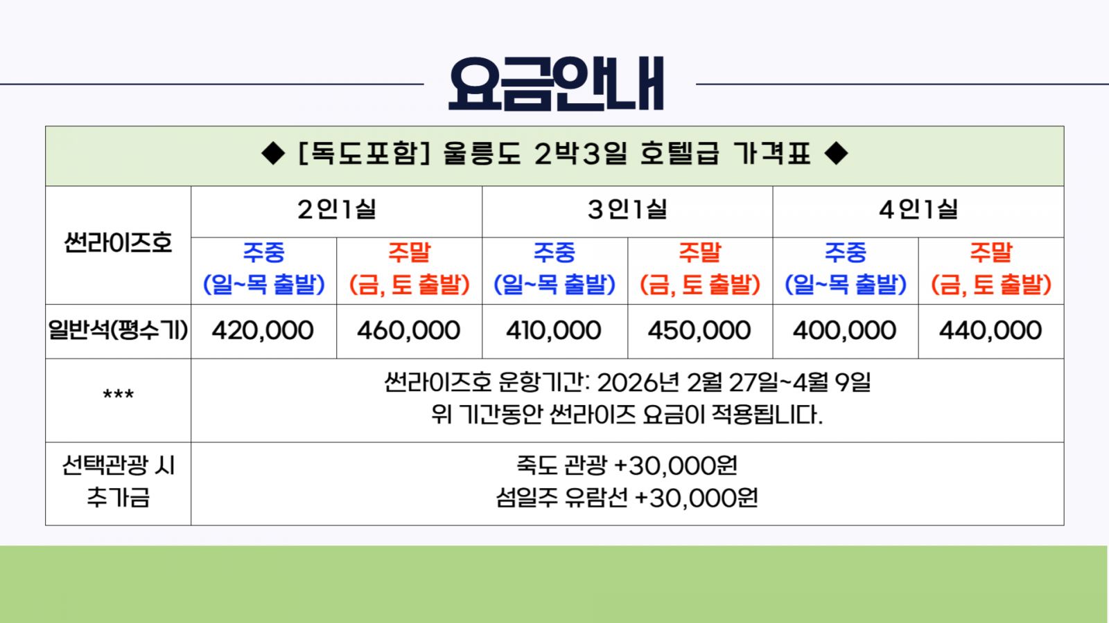 ※ 썬라이즈호는 2026년 2월27일 ~ 4월9일 출발일 경우 예약 가능합니다.