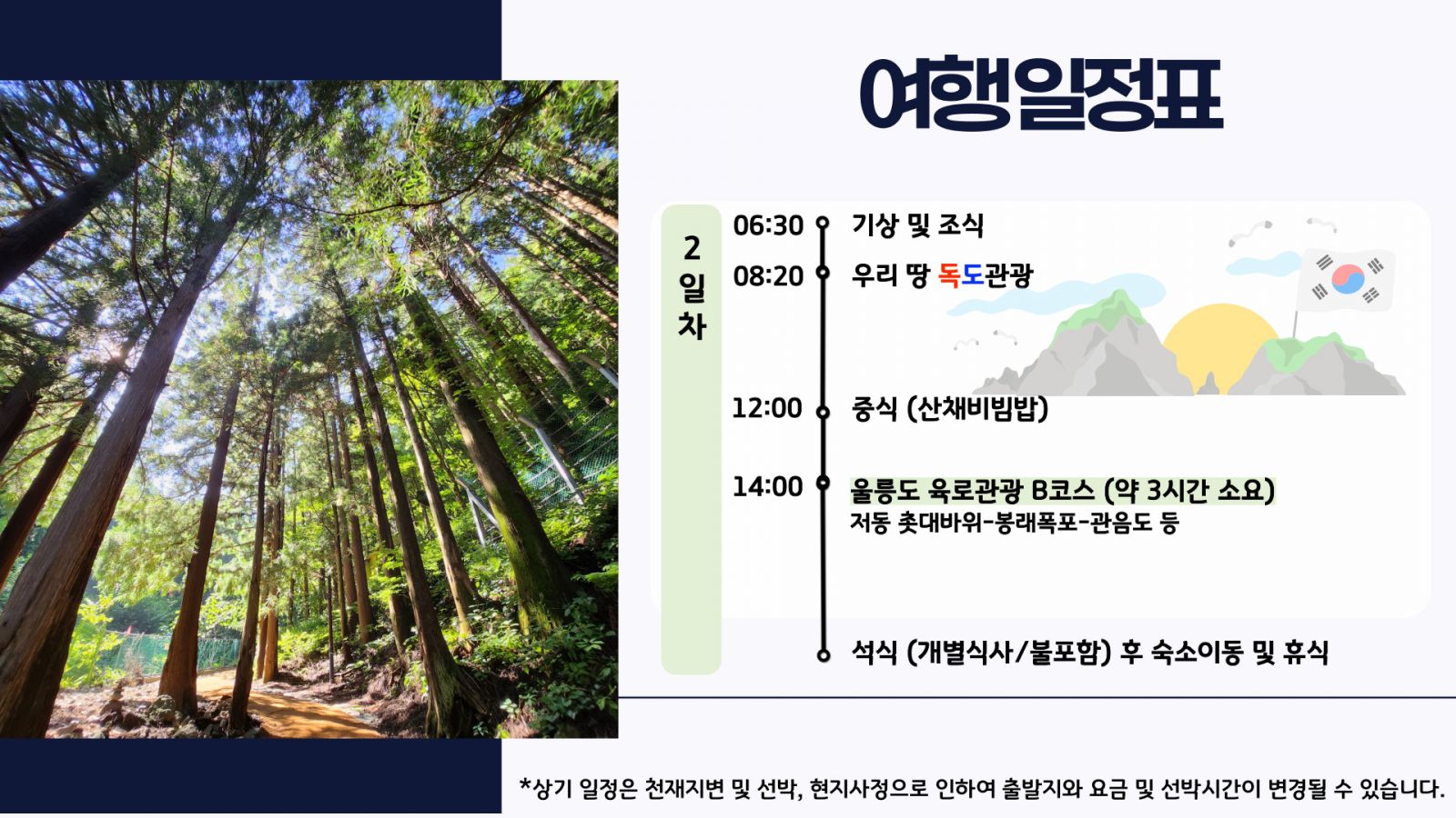 - 울릉도에 체류된 채로 결항 될 경우 선박 출항 순서는 입도 순서에 따르며, 연장되는 모든 숙박비용 및 개인비용은 고객 부담입니다.
