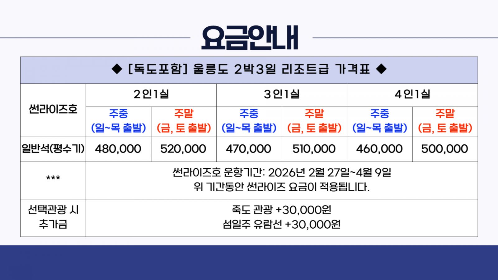 - 울릉도에 체류된 채로 결항 될 경우 선박 출항 순서는 입도 순서에 따르며, 연장되는 모든 숙박비용 및 개인비용은 고객 부담입니다.