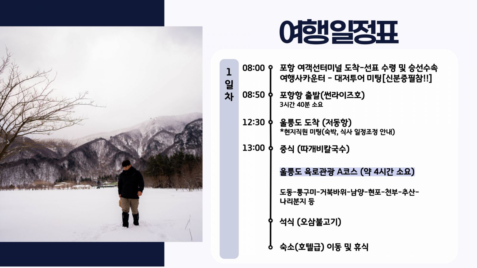 - 섬 지역 특성상 울릉도 숙소는 열악하므로 고객님의 협조와 양해 부탁드립니다.(개인 세면도구 필 참)